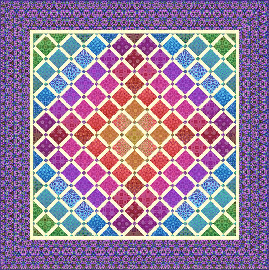 I've seen this quilt in person, and it is striking. A bold dynamic colorwash jumps off the quilt with the gardenia sashing. The lattice effect set on point adds interest and pulls your eye along the color changes. All the included fabrics are individually labeled and match the pattern cover for the quilt top and binding. Backing fabric not included.