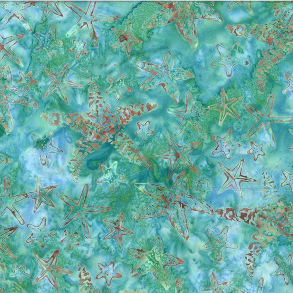 Dana Michelle's Along the Shores batik collection by Hoffman Fabrics. Commonly found along seashore tidal pools, these critters are shown in a lovely blue green. Fun fact... Starfish have an eye at the end of each arm!