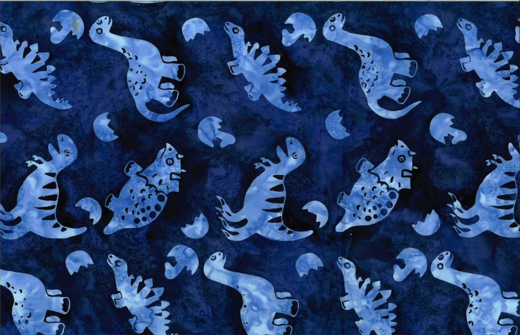 Different baby dinosaurs all in blue. This fabric shows T-rex, Brachiosaurus, Stegosaurus, Stirakosauri, baby dino's just hatching and egg shells. These friendly looking dino's are geared towards younger children.