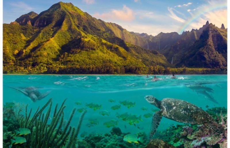 Hoffman Fabrics Call of the Wild Ocean Landscape digital panel. This landscape reminds me of Hawaii, lush mountains and clear oceans with abundant sea life. Peaceful and beautiful.