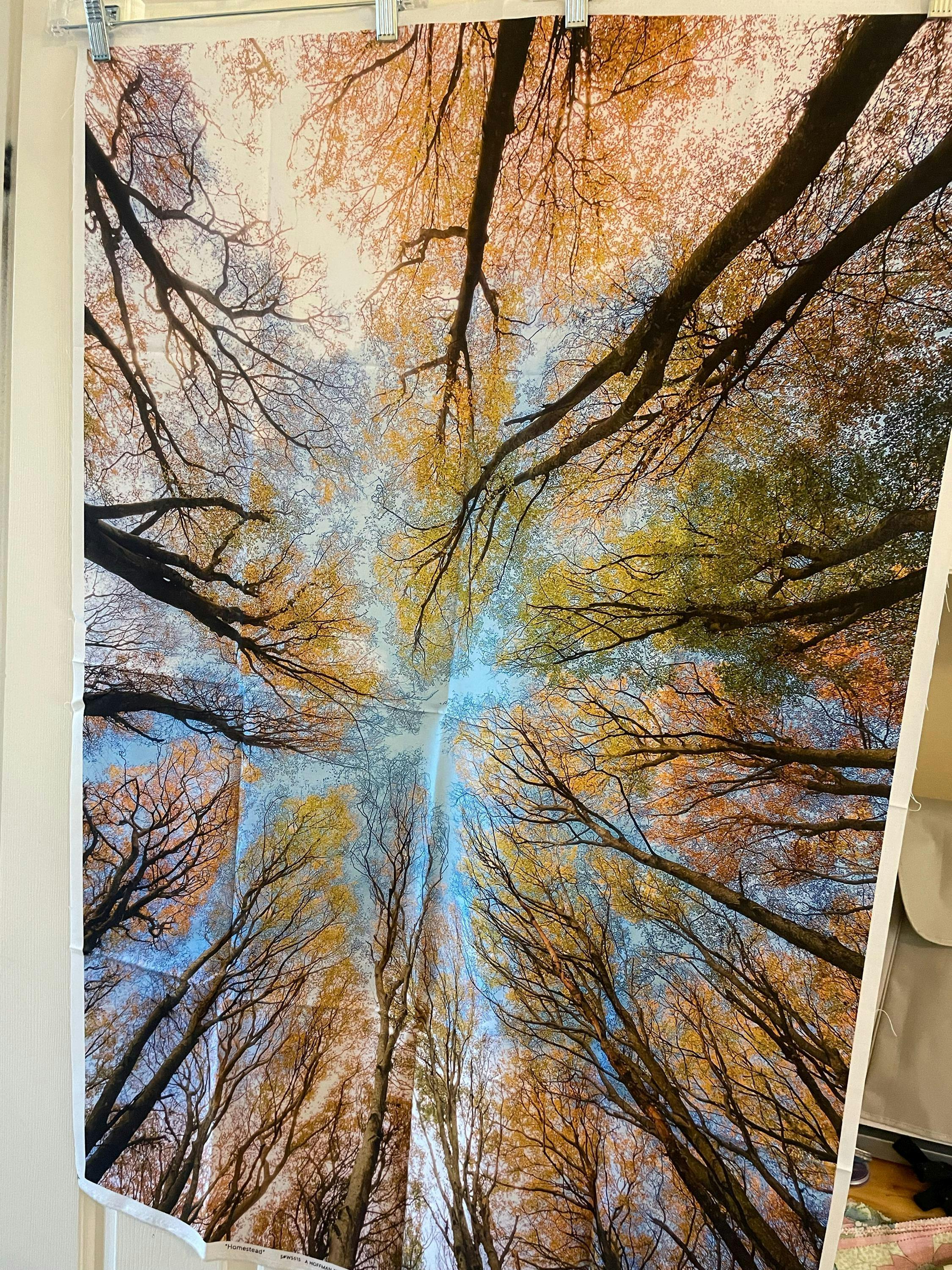 Hoffman Fabrics Homestead Trees spectrum digital fabric panel. Walk into the forest, lay down on the ground and look up to the sky. This could be early spring or fall. You choose the coordinating fabrics to build your story.