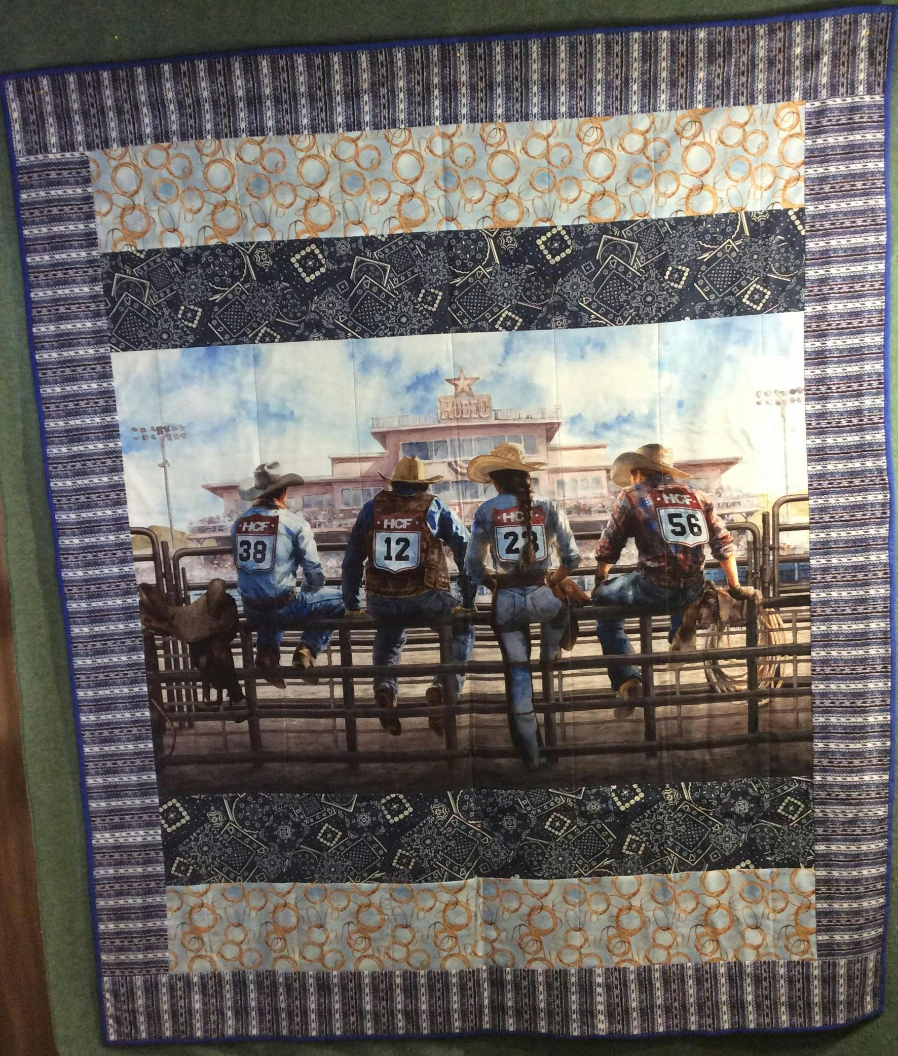 Hoffman Fabrics Rodeo Dreams digital cotton fabric. A woven blanket stripe fabric that looks like a horse pad blanket! The design runs the length of fabric.