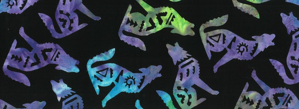 Yardage is sent as one continuous piece of fabric. A rainbow of colored coyotes on a black background.