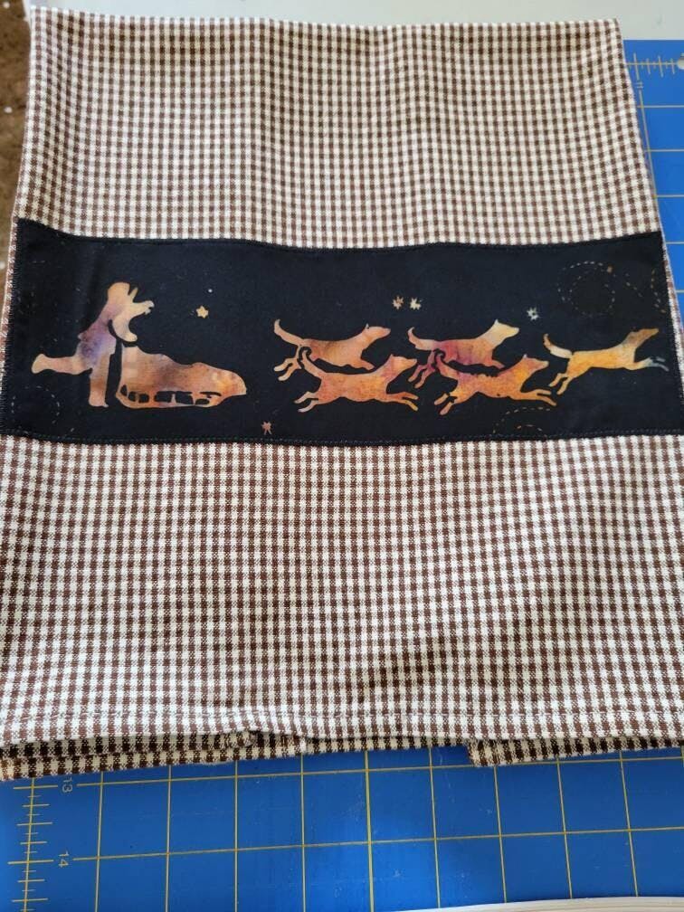 The musher design runs the width of fabric selvage to selvage and the background is black.