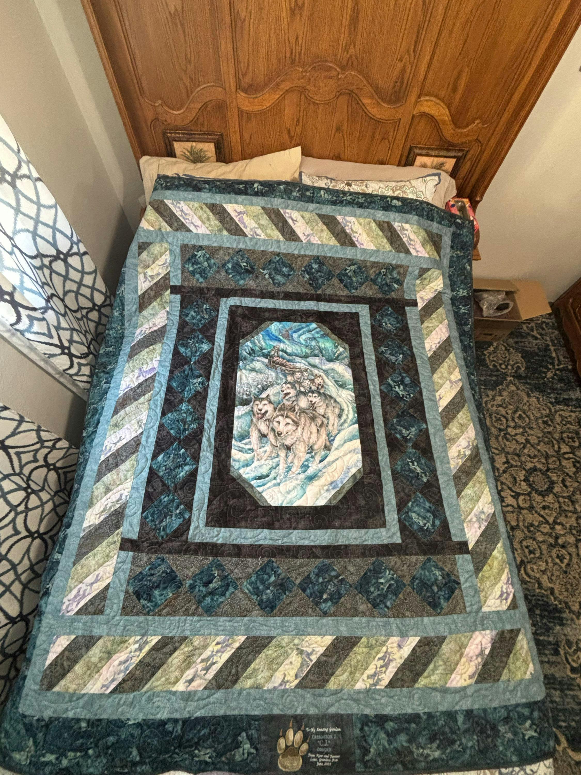 This is a once a year custom special order fabric issued each May. Yardage is sent as one continuous piece of fabric. The musher design runs the width of fabric selvage to selvage.