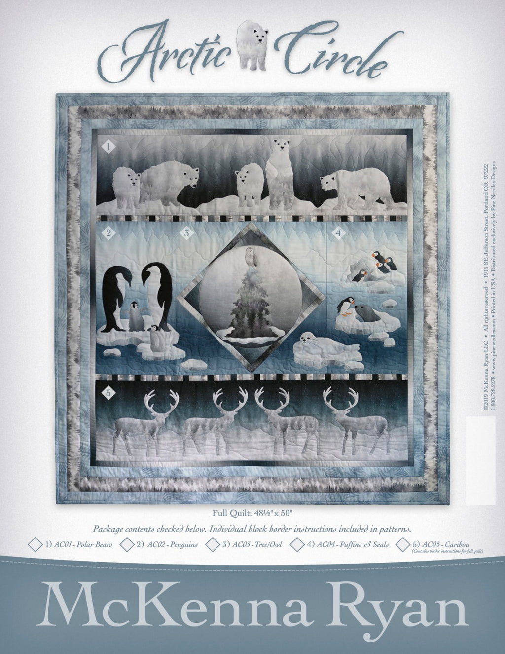 Pine Needles Arctic Circle Penguin traditional applique quilt kit with pattern designed by McKenna Ryan. This quilt pattern is designed for raw edge fusible applique. The featured fabrics are all from the digital Painted Forest fabric collection and match the pattern cover. This is block number two from the full Arctic Circle quilt shown in the second photo.